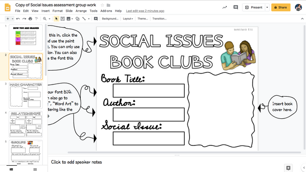 Collaborative posters as end of unit assessments for book clubs. Each slide is a different aspect I am assessing and also another piece of the poster.
